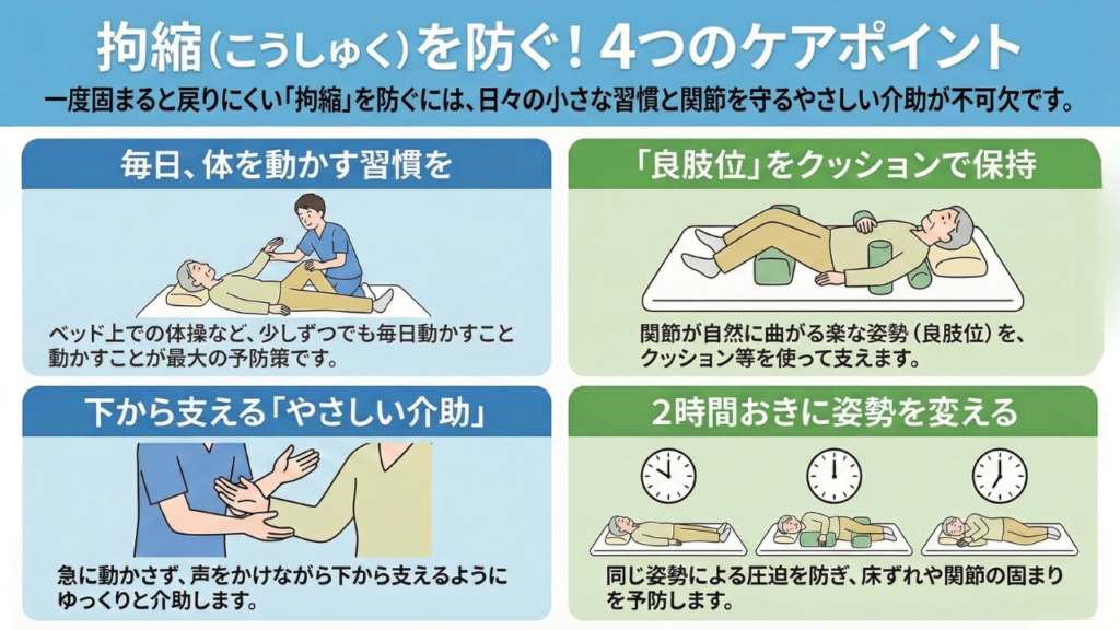🔹 やさしい介助 急に動かしたり強く引っ張ったりすると、かえって拘縮が進みます。声をかけながら、下から支えるようにやさしく介助しましょう。