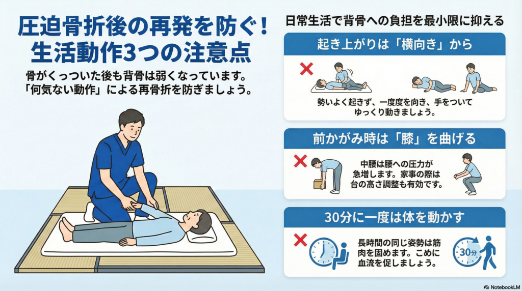 骨がついても、圧迫骨折の影響で背骨が弱くなり、再骨折や痛みの再発が起きやすい状態です。以下の動作には特に注意が必要です。