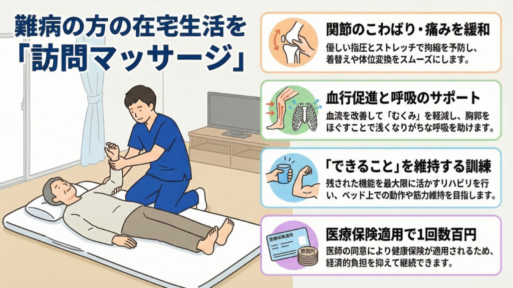 そこで有効なのが、医療保険が適用される訪問リハビリマッサージです。国家資格を持つ専門家がご自宅へ訪問し、難病と向き合う生活をサポートします。