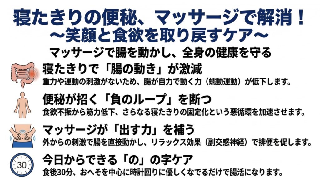 寝たきりの方の便秘は、水分や食事だけでは解決しにくい問題です。身体活動の低下、腹筋力の喪失、自律神経の乱れ——この3つが複合的に絡み合っているからこそ、腹部マッサージという「外からの専門的なアプローチ」が大きな力を発揮します。
