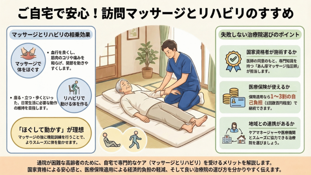- 訪問マッサージ: 国家資格を持つあん摩マッサージ指圧師が行う医療行為。血行改善、筋肉の緊張緩和、関節の柔軟性維持を目的とします。