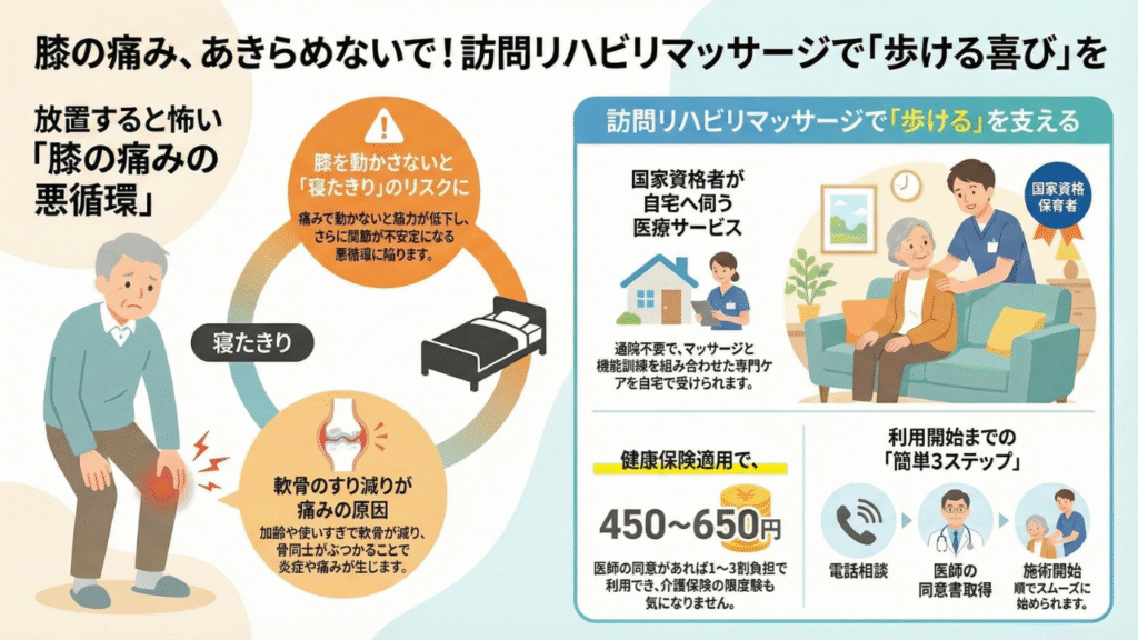 この記事では、変形性膝関節症の特徴と、訪問リハビリマッサージでできることをわかりやすく解説します。