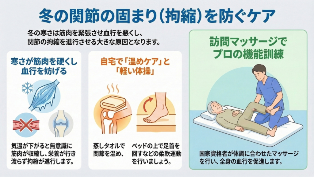 拘縮は、在宅での継続的なケアが何より大切です。特に、気温が下がる季節は、拘縮が悪化しやすい時期です。