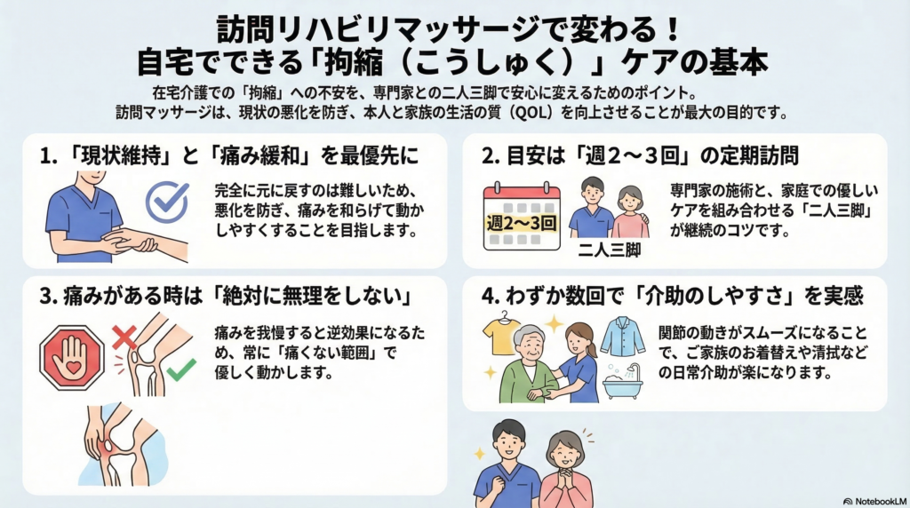 拘縮のケアは、ご本人とご家族が**「よく分からない」という不安を解消し、安心して在宅でのリハビリ**を続けることが大切です。
