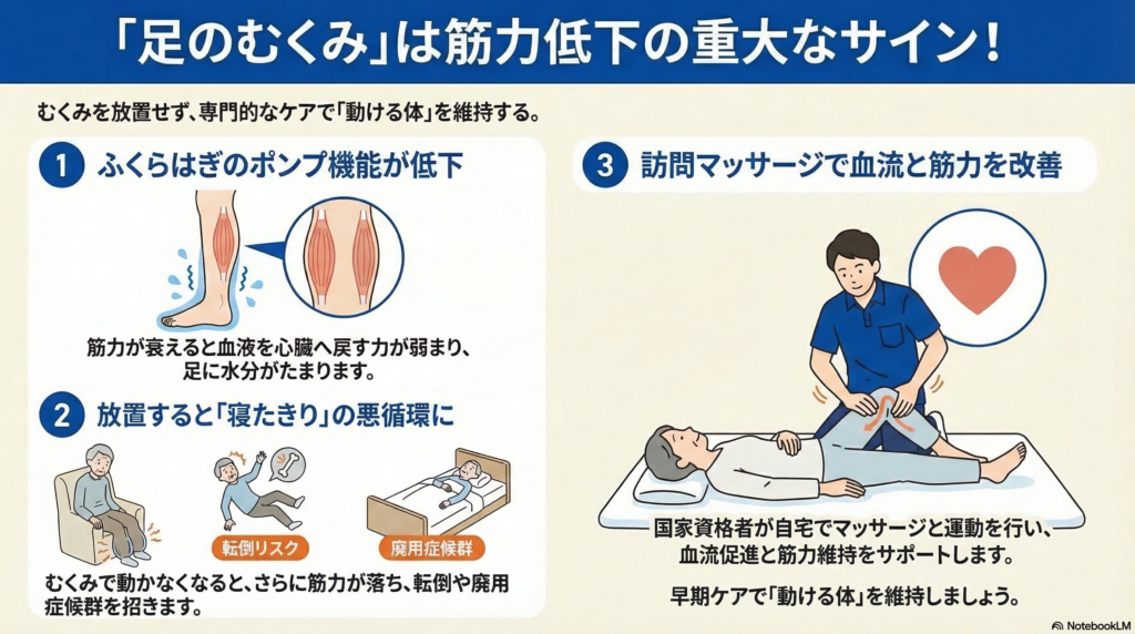 高齢者の下肢の**浮腫(むくみ)**は、単なる水分のたまりだけでなく、筋力低下と密接に関わる重要なサインです。