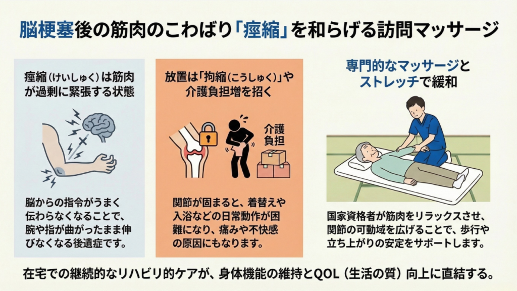 👉 脳梗塞の後遺症が心配なご家族へ|訪問リハビリマッサージでできること をご覧ください。