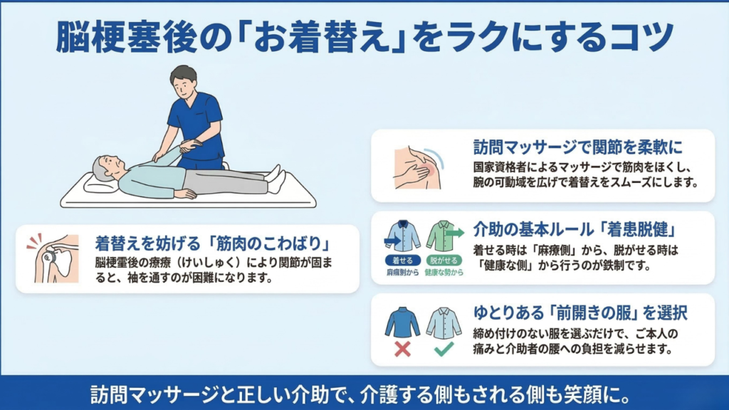 当院の訪問マッサージは、脳梗塞後の着替えを楽にするための在宅リハビリ的ケアを提供します。国家資格者がご自宅までお伺いし、リハビリマッサージと機能訓練を行います。