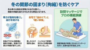 - 当院の役割: 国家資格を持つあん摩マッサージ指圧師が、ご自宅や老人ホームに伺い、硬くなった筋肉をマッサージでほぐし、関節の柔軟性を保ちます。また、「機能訓練」(リハビリ)で、歩行や立ち上がりの練習を行い、QOLの維持をサポートします。