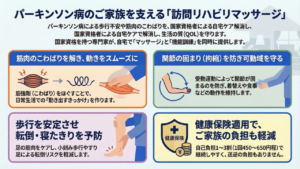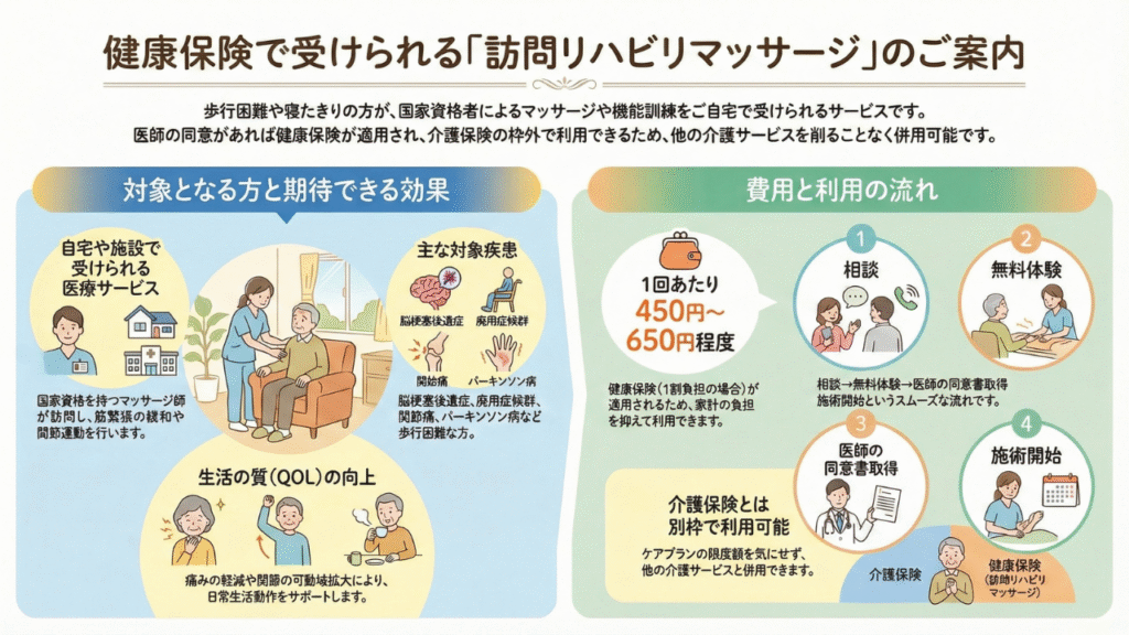 そんな疑問をお持ちのご家族へ。この記事では、健康保険を使って受けられる訪問リハビリマッサージの対象となる病気や症状、利用の流れを、できるだけ専門用語を使わずに分かりやすくご紹介します。